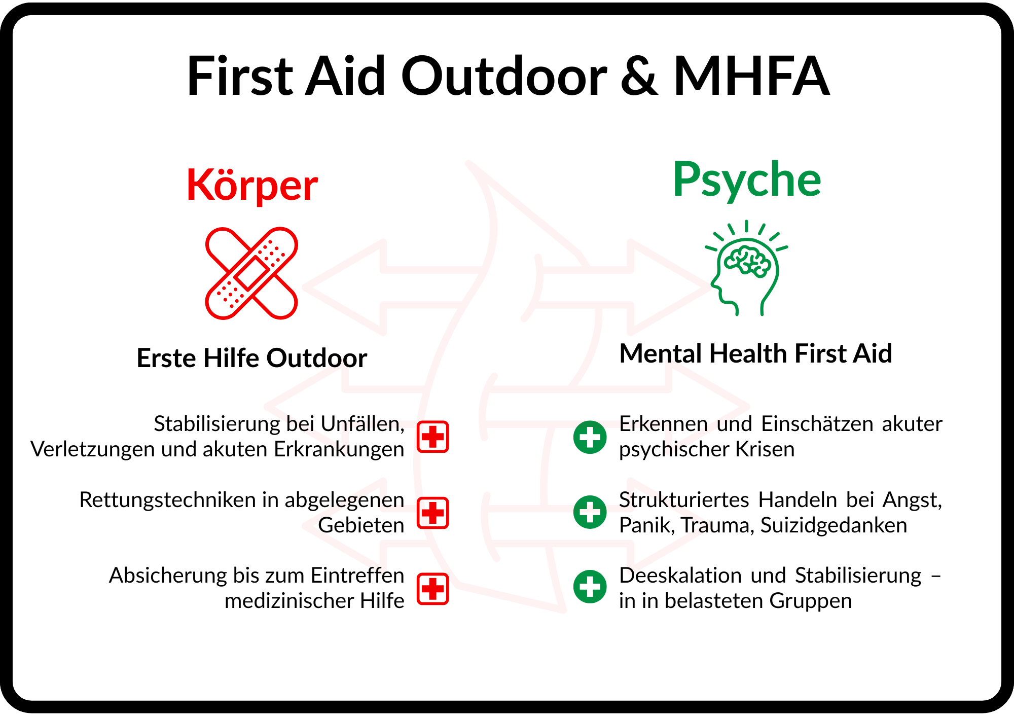 Anwendung strukturierter Schritte der „Mental Health First Aid“ bei Einzelpersonen und Gruppen in naturnahen Settings. - Reflexion der eigenen Psychohygiene: