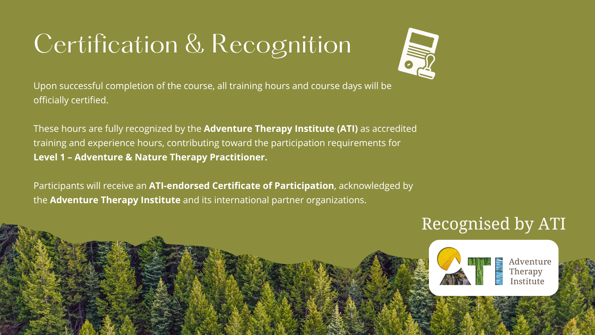 Are you still looking to gain experience and documented practice hours before beginning your professional journey in Adventure & Nature Therapy? Then this course is the perfect place to start. ATI recognizes 60 hours for this training and was directly involved in its development – ensuring you are thoroughly prepared to begin your qualification as an Adventure & Nature Therapy Practitioner.