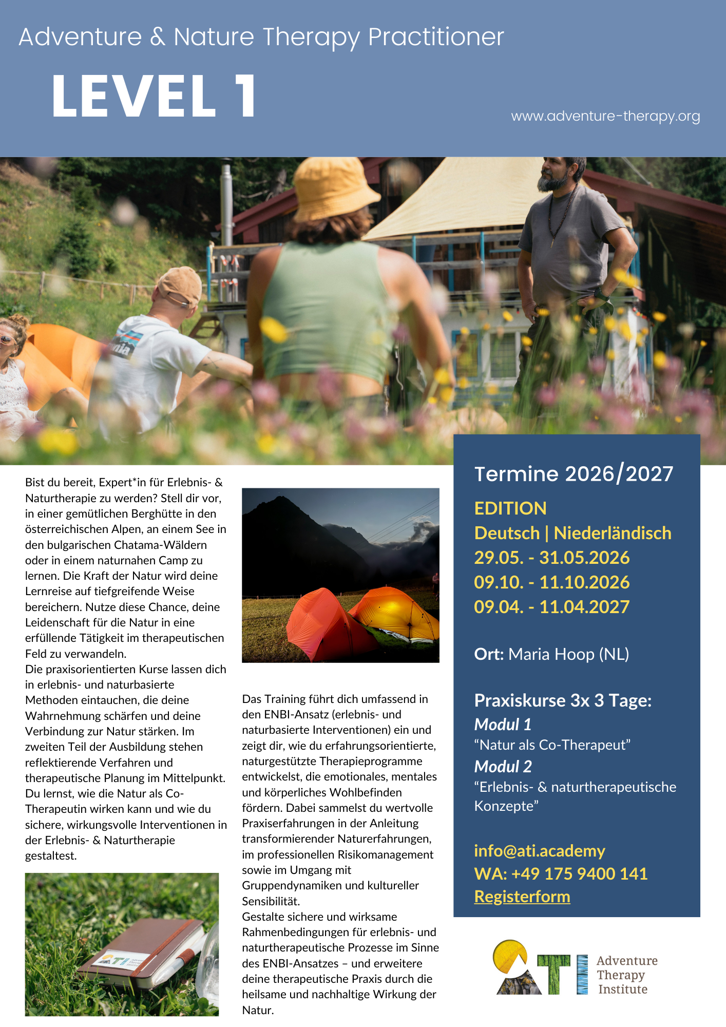 Der internationale Abschlusstitel “Adventure & Nature Therapy Practitioner” (Level1) ist an diverse Nachweise und Bedingungen geknüpft, die in CHECKLISTEN aufgeführt werden.