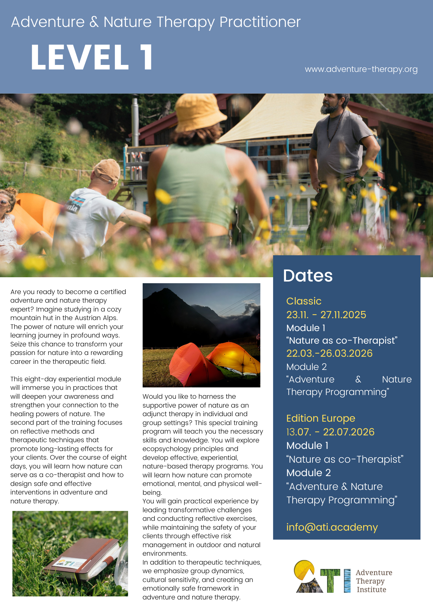 In the US, the AEE already offers a formal certification in Adventure Therapy. The ATI training structure, with its three qualification levels (Levels 1–3), is designed to enable you to later obtain recognition and certification in the US. We maintain direct contact with the AEE Board of Directors and continuously adapt our content to current developments.